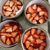 イチゴを型に敷き、その上から生地を流して焼き、焼き上がったらひっくり返すアップサイドダウンケーキです。